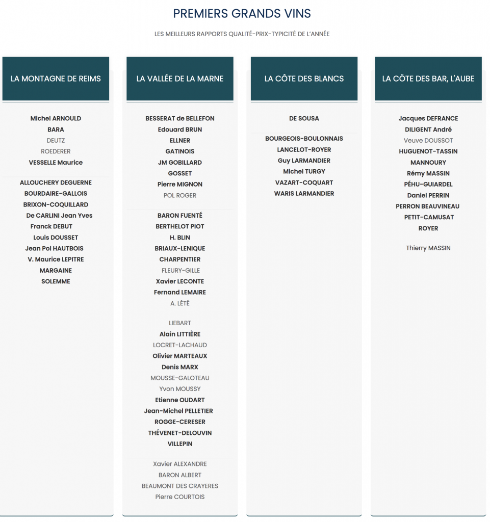 Ces vignerons et petites maisons, qui élèvent des cuvées d’exception, racées, authentiques, avec une forte personnalité entre 40 et 100 €, parfois plus, vous allez les retrouver à la tête du Classement. En face, à l’exception des rares maisons incontournables que nous sélectionnons (Gosset, Pol Roger, Roederer…), les cuvées de prestige ultra connues des grandes maisons sont à des prix parfois étonnants 250 €, 300 €, 350 €…,superbes, certes, mais… ne vaut-il pas mieux comprendre la Champagne en débouchant un Grand Cru spécifique ou un assemblage/élevage hors normes qui vont exciter nos papilles? Là on aurait la salinité du Pinot meunier, ici la minéralité des grands blancs du Chardonnay, là l’ampleur du Pinot noir… C’est cela un grand vin, et vous allez voir qu’il y en a vraiment dans la région !