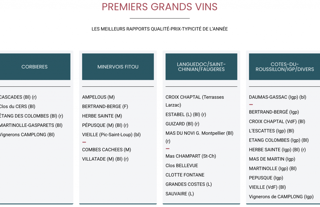 Ces vignerons élèvent des vins racés et typés, dans l’ensemble du territoire, des Corbières à Saint-Chinian, du Pic Saint-Loup au Minervois, du Fitou aux Terrasses du Larzac ou aux Igp. Les vins rouges atteignent de très beaux niveaux, les blancs s’affirment, les rosés sont parfumés et friands… Tout serait parfait si les incendies de l’été dernier ne venaient entacher ce tableau. Raison, en tout cas, de soutenir encore plus ces vignerons.